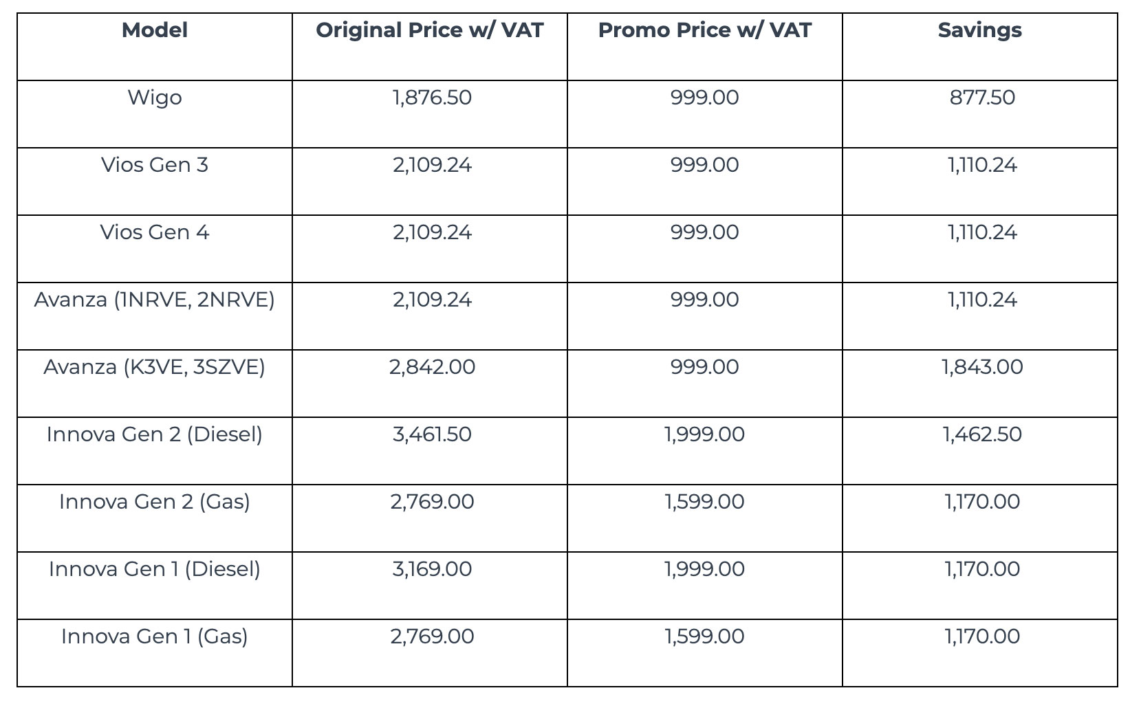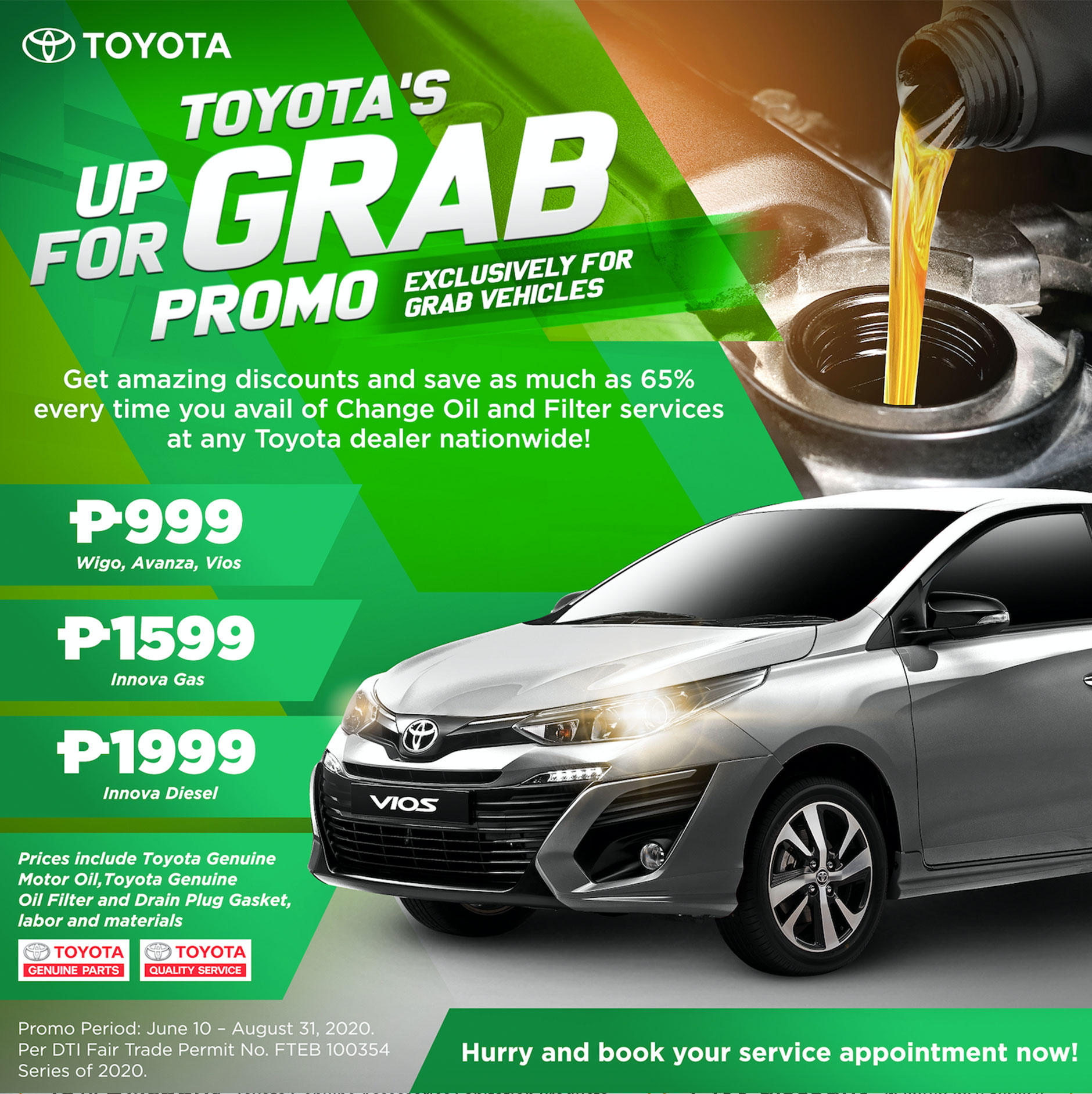 Promo is available to all active Grab Toyota Vios, Avanza, Wigo and Innova vehicles that will avail service at any Toyota Service Center nationwide within the promo period.